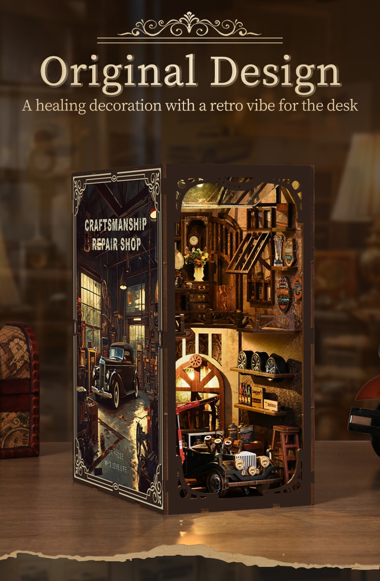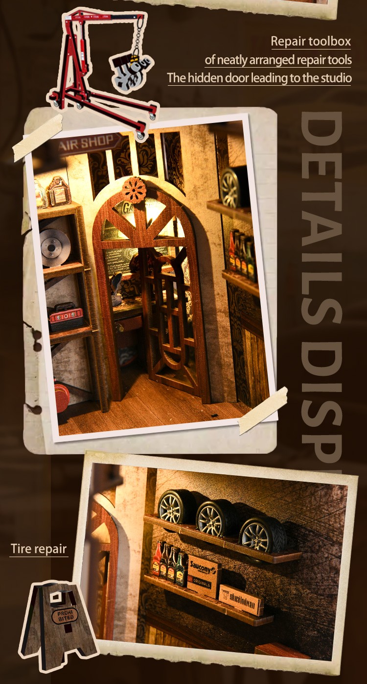 The core design concept of this Diy Book Nook Kit is “Replicating real scenes, freezing the warmth of machinery.” The kit brings the vivid daily life of an auto repair shop into the compact cubic space of a bookend.