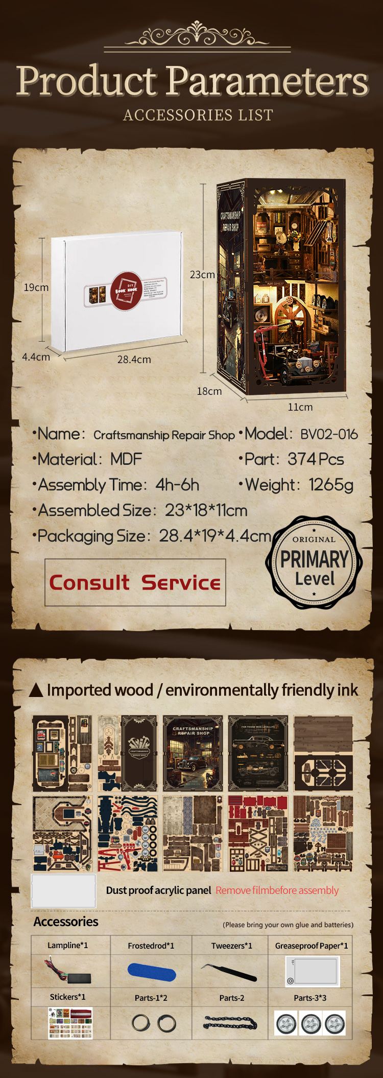 The Craftsmanship Repair Shop (Model: BV02-016) is a premium Diy book nook Kit inspired by nostalgic artisan workshops. With 374 precision-cut MDF pieces, this kit allows you to create a stunning 3D miniature scene that fits perfectly on your bookshelf—turning your shelf into a secret world of craftsmanship and creativity.