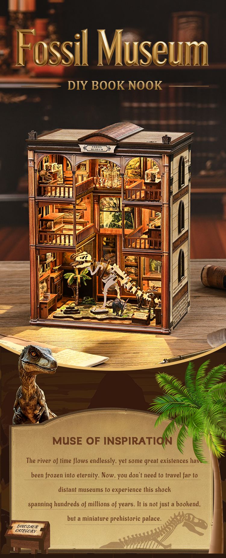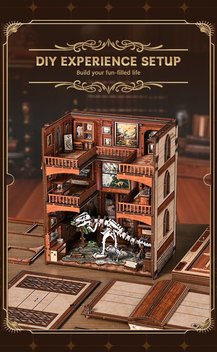 The kit includes everything you need to bring a spotlight book nook or bookshelf alley to life. Whether you're adding character to your home, office, or bookstore, this diorama makes a striking statement piece. Crafting it will take you on a nostalgic journey through time, where fossil skeleton details and acrylic display cabinets transport you to an era long past.