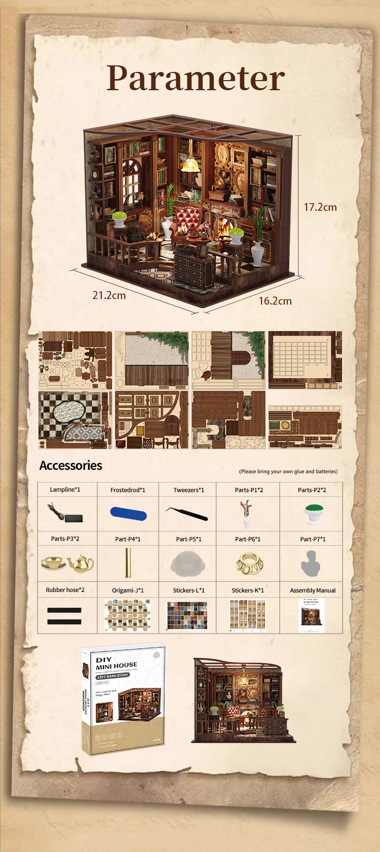 Once finished, the Left Bank Study DIY Doll House becomes a charming decoration for shelves, desks, and home libraries.