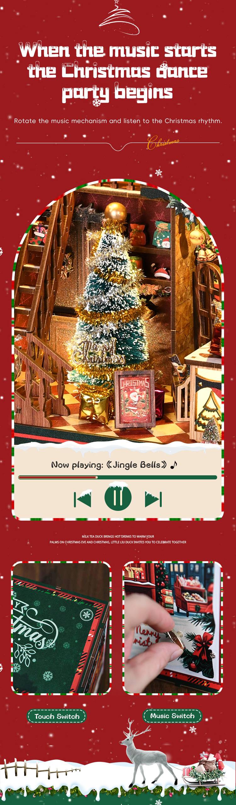 The Christmas Shop recreates a heartwarming winter street corner decorated with glowing lights, festive gifts, and snowy elements. When the warm LED lights turn on at night, the scene transforms into a glowing miniature house Christmas wonderland. Rotate the built-in music mechanism and enjoy classic Christmas melodies—making the tiny shop "open for the season" and filling the air with joyful holiday spirit.
