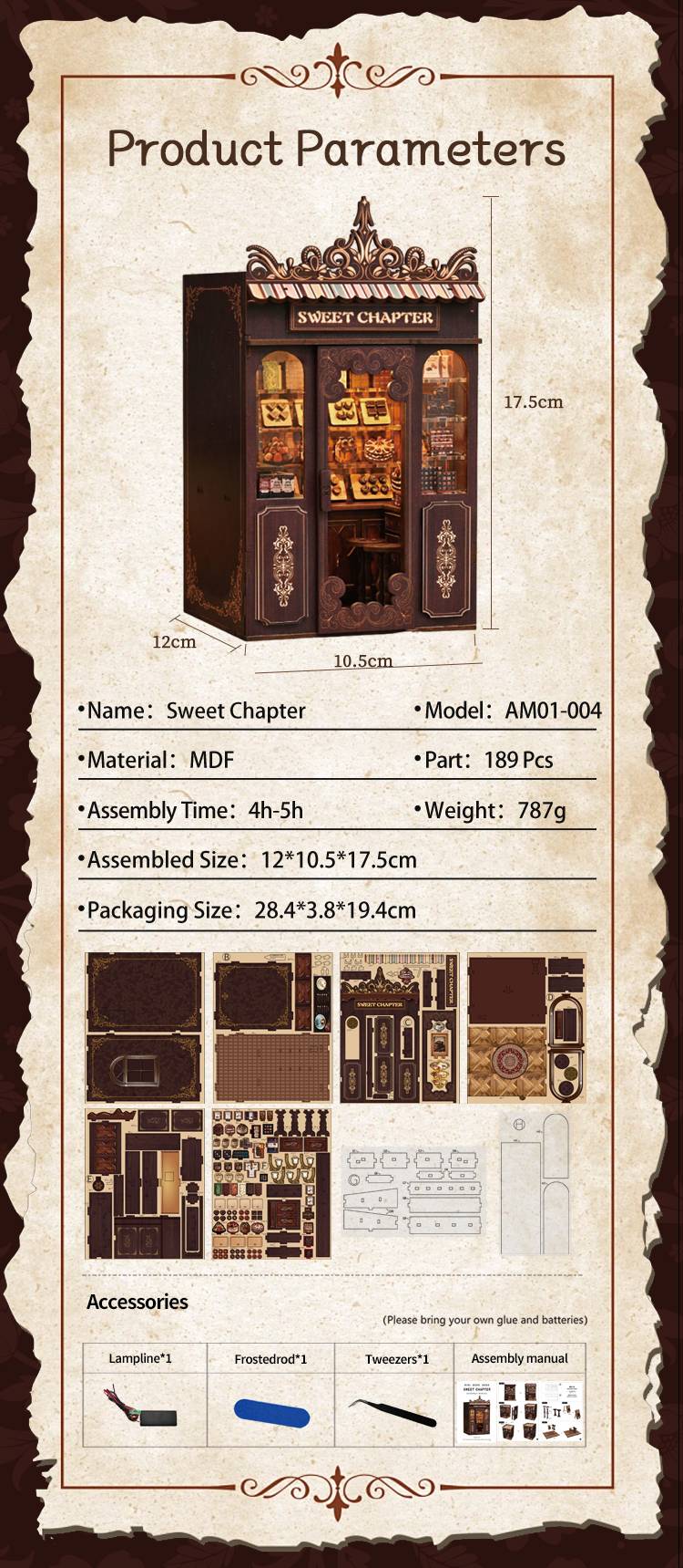 The finished Sweet Chapter DIY Mini House measures 12 × 10.5 × 17.5 cm, making it a charming addition to any bookshelf, desk, or display area. Its compact size allows it to fit seamlessly into your space while still making a statement.