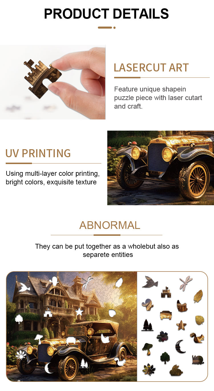 The 3D Castle Puzzle is a beautifully designed 3D puzzle castle that brings a touch of vintage charm into your home. This castle jigsaw puzzle features intricate details, including a classic castle scene with a vintage car, giving it a unique and realistic appearance. Made from high-quality 4mm poplar plywood, each piece is precision-cut with a laser cutting process to ensure smooth edges that are safe for hands.
