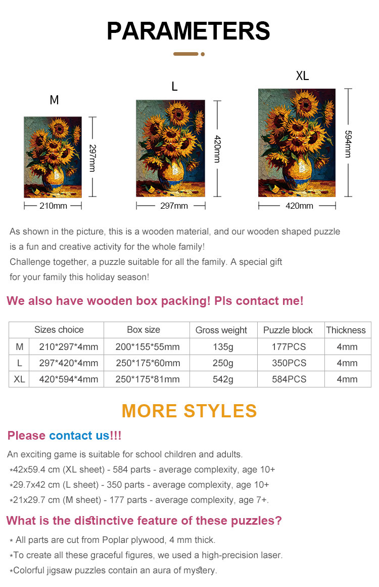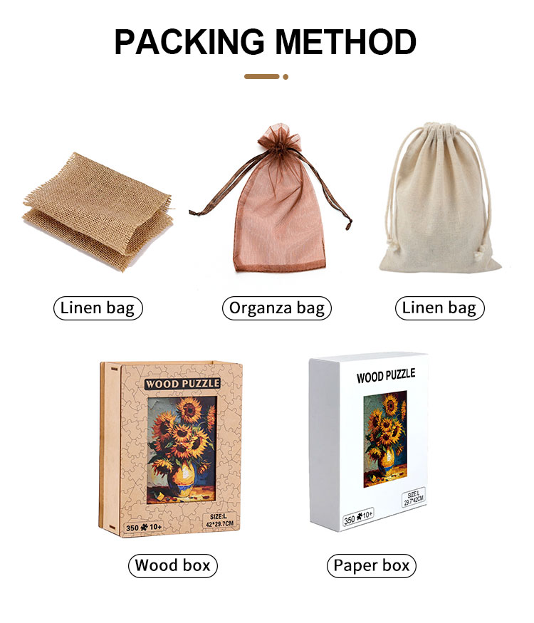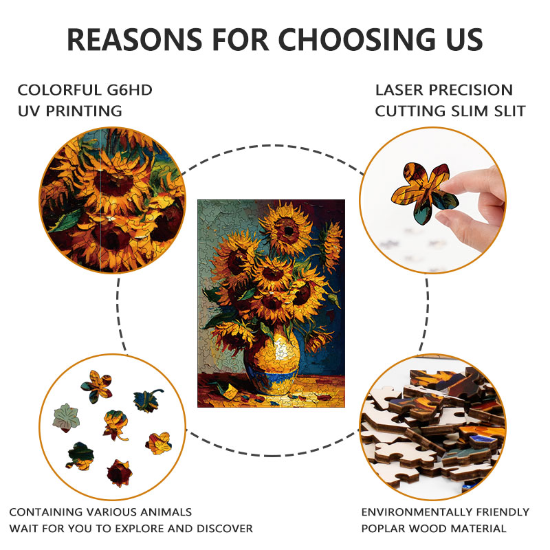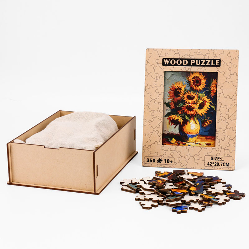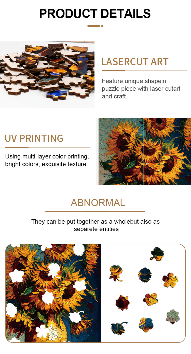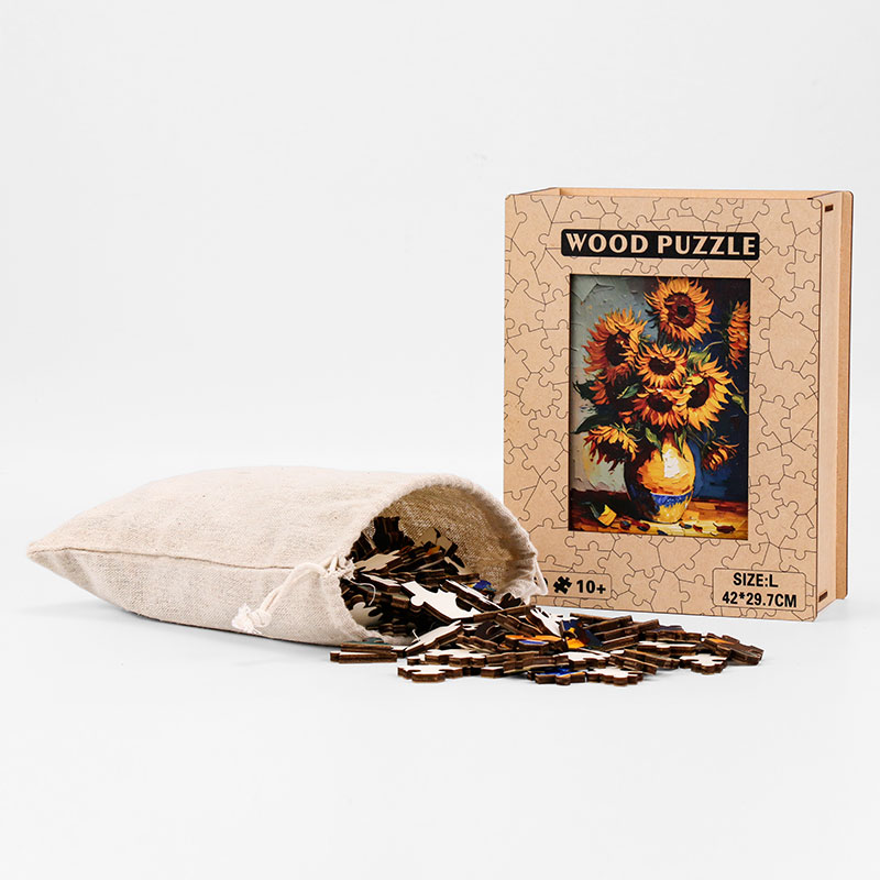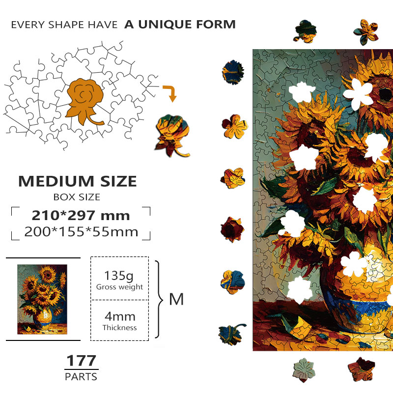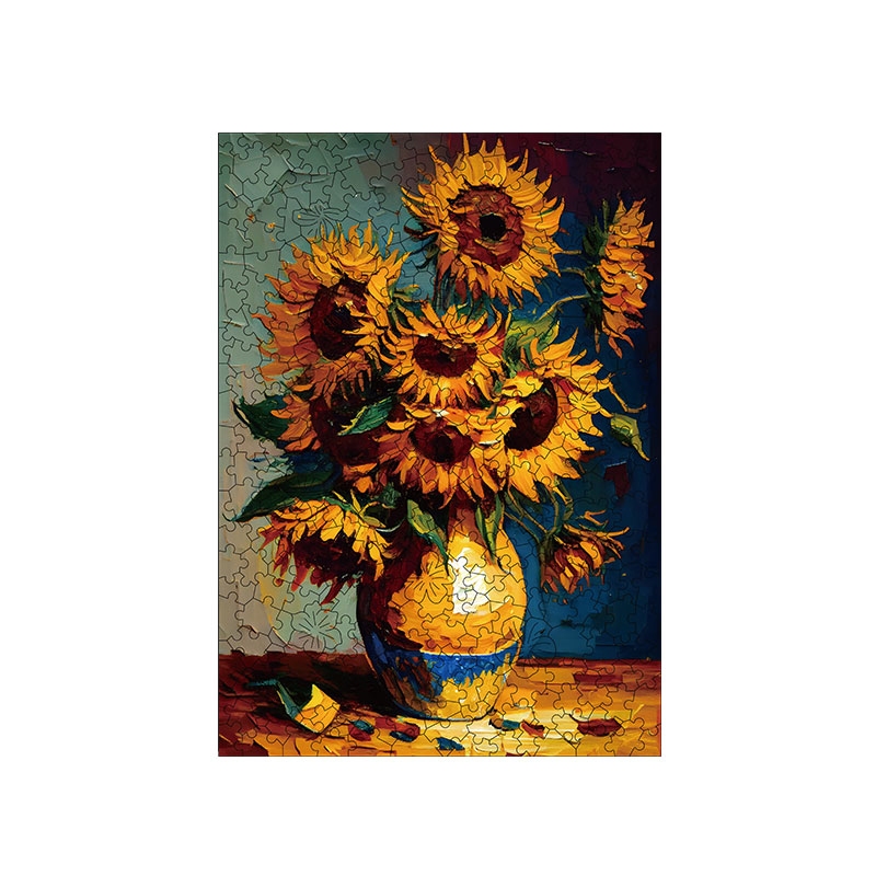 Bring the iconic beauty of Van Gogh’s sunflowers into your home with our Sunflower Puzzle, a unique wooden puzzle designed for creativity and fun. Each piece of this sunflower jigsaw puzzle is uniquely shaped and laser-cut from 4mm Poplar plywood, ensuring smooth edges that won’t hurt hands. The colorful illustration is UV printed with multi-layer color printing for bright, vibrant colors and exquisite texture.