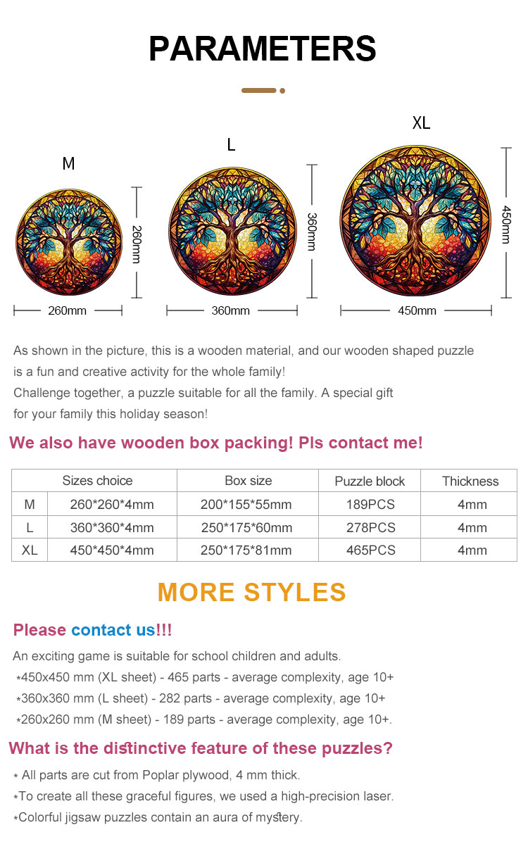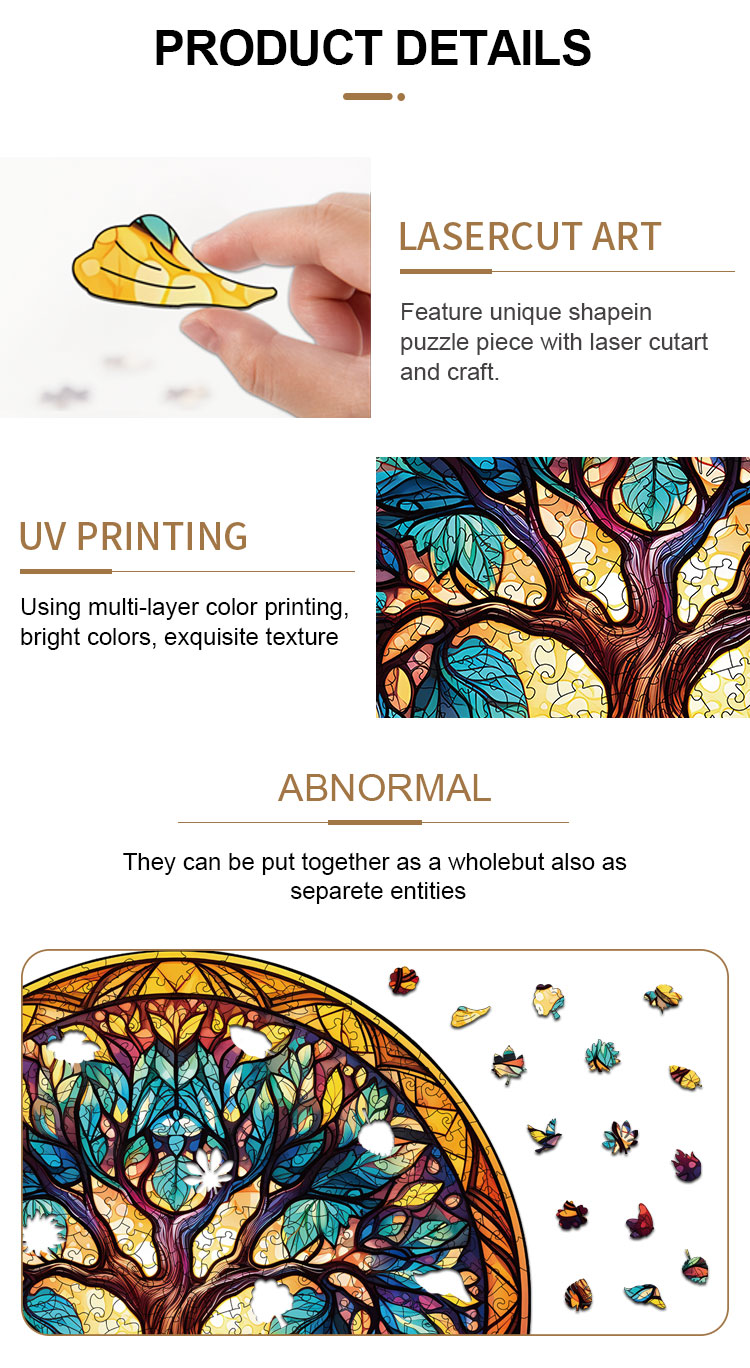 Experience the magic of creativity and craftsmanship with our Tree of Life Jigsaw Puzzle, a beautifully designed set of wooden jigsaw pieces that blends art and fun. Each piece is crafted using high-precision laser cutting technology to create unique shapes, while UV printing delivers vibrant, multi-layer colors and exquisite textures. This puzzle is more than a game—it’s a creative journey, allowing you to assemble the pieces as a whole or explore each element as a separate entity. Perfect for puzzle enthusiasts, family bonding, or as a thoughtful custom puzzle gift.